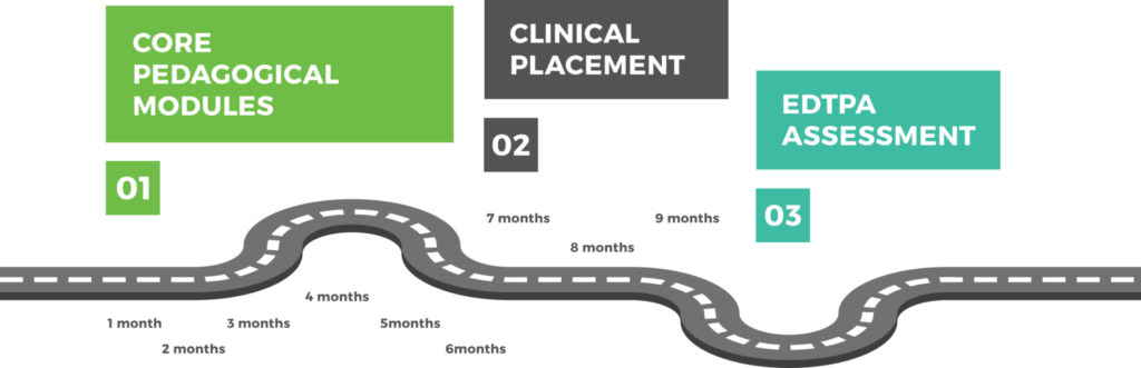 In Hawai’i, for example, the core curriculum is typically 360 hours (12 weeks) of content, followed by a 450 hour (12 weeks) clinical placement, Hawaiian History, Culture and Language training (10 hours online) and any required Praxis and edTPA assessments. While it is possible for students to complete TCP in as little as 6 months, 9 months is the norm. In line with state standards, a new teacher can then apply for a provisional or standard license.