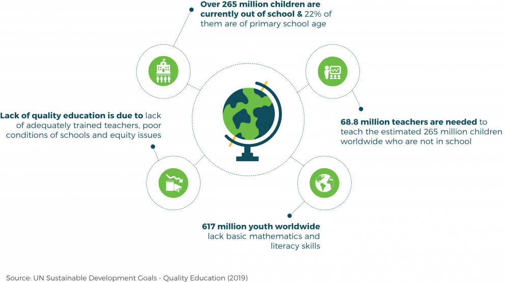 24.4 million primary school teachers and 44.4 million secondary school teachers are needed to teach the estimated 265 million children worldwide who are not in school.